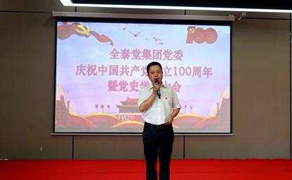 2021年6月29日,在喜迎中国共产党百年华诞之际,全泰堂集团有限公司党委在集团“天雄远志”会议中心召开庆祝中国共产党成立100周年大会暨党史学习会。来自全泰堂集团各部门在职共产党员及入党积极分子共57人参会,大会由集团党委委员、营销党支部书记饶胜同志主持。